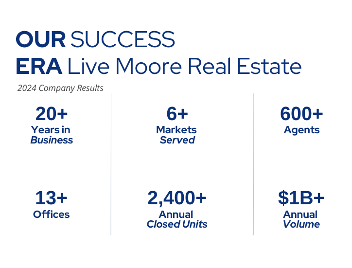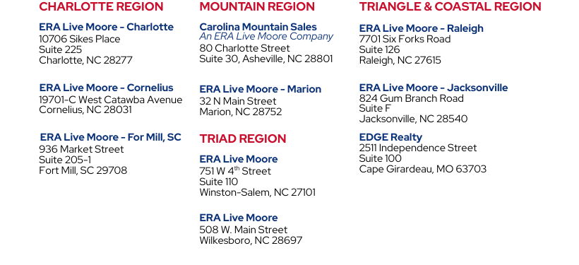 Our success with the Relocation industry has been a particular focus since ERA Live Moore was established. We go beyond our client’s expectations whether buying or selling, offering state-of-the-art advertising and marketing resources that showcase available homes in a desired market. We offer some of the most comprehensive relocation and referral services in the Carolinas.